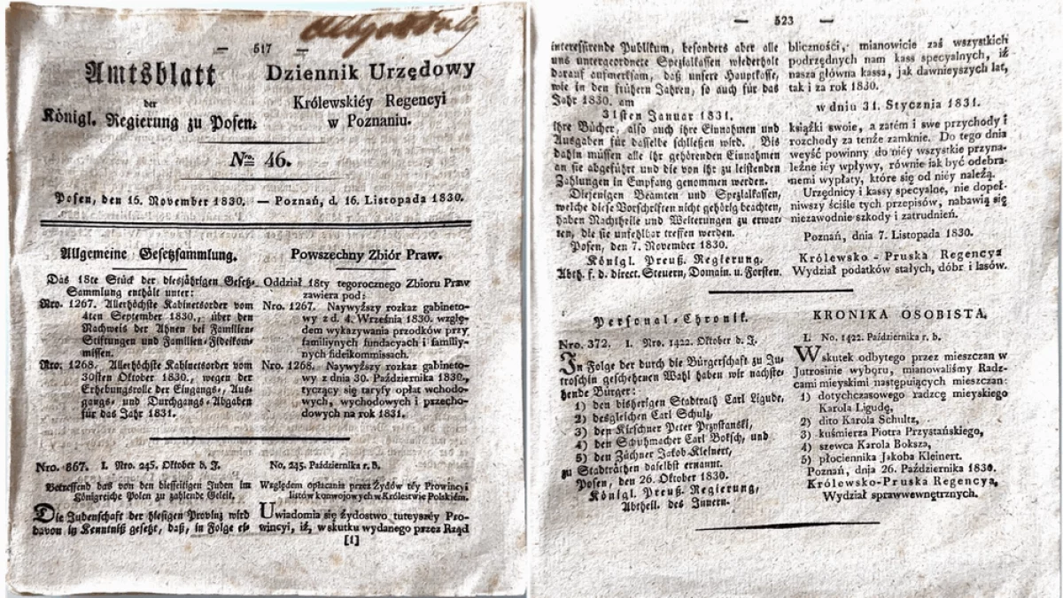 Jakiś czas temu miłośnik historii z Jutrosina pochwalił się nam znaleziskiem, które nakreśla obraz życia mieszkańców Jutrosina niemal 200 lat temu. Jak wyjaśnia, są to dwa egzemplarze gazety „Dziennik Urzędowy Królewskiej Regencyi w Poznaniu”.
