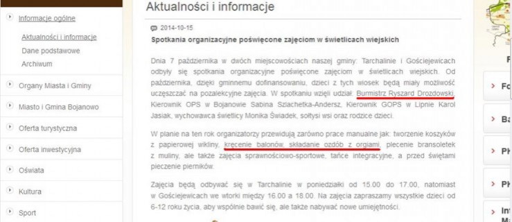 „Tuż przed wyborami samorządowymi w gminie Bojanowo powołano nowego burmistrza. Jeszcze w tym roku w dwóch miejscowościach tej gminy planowane jest m.in. kręcenie balonów oraz składanie ozdób z orgiami” - napisał do redakcji mieszkaniec gminy Bojanowo po przeczytaniu zapowiedzi zajęć świetlicowych, które ukazały się na stronie internetowej urzędu miejskiego.