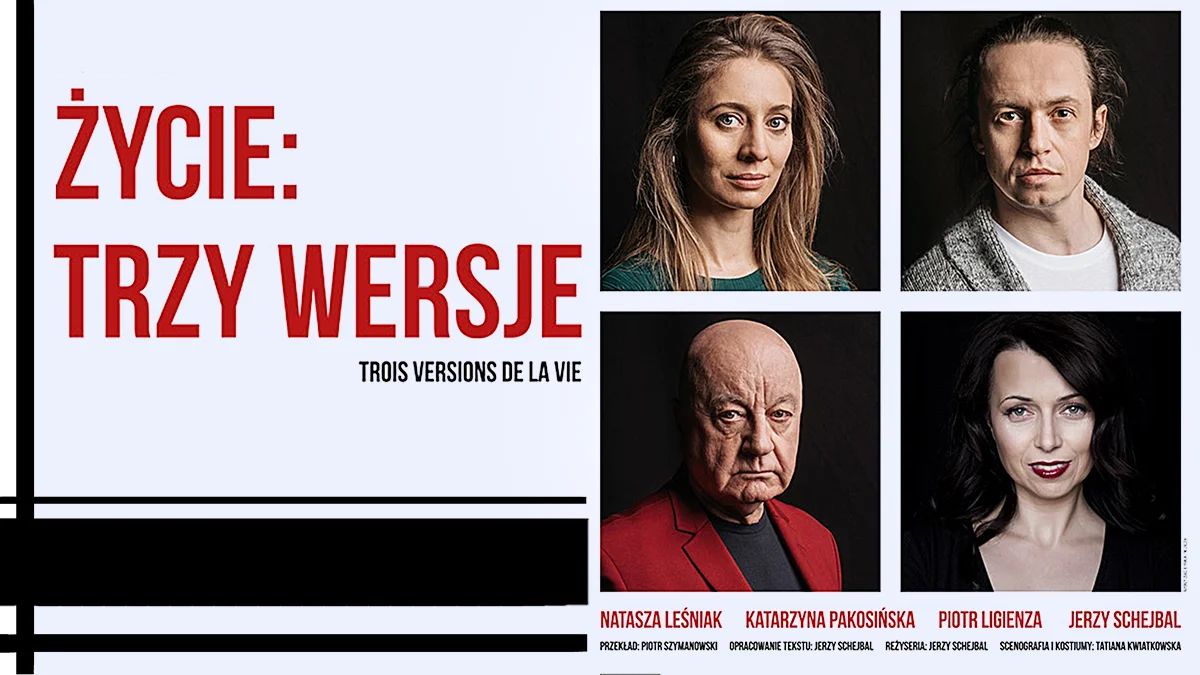 Przedstawienie „Życie: Trzy wersje”, to tragikomedia francuskiej dramatopisarki Yasminy Rezy - mistrzyni sztuk kameralnych, autorki bardzo popularnej w Polsce sztuki „Bóg mordu”, przeniesionej w 2011 roku na ekran przez Romana Polańskiego pod tytułem „Rzeź”. Oba utwory mają podobny schemat: wydarzenia rozgrywają się w przestrzeni zamkniętej, bohaterami są dwie pary małżeńskie. Powstanie obu dramatów dzieli sześć lat, „Życie: Trzy wersje” poprzedziło „Boga mordu”.