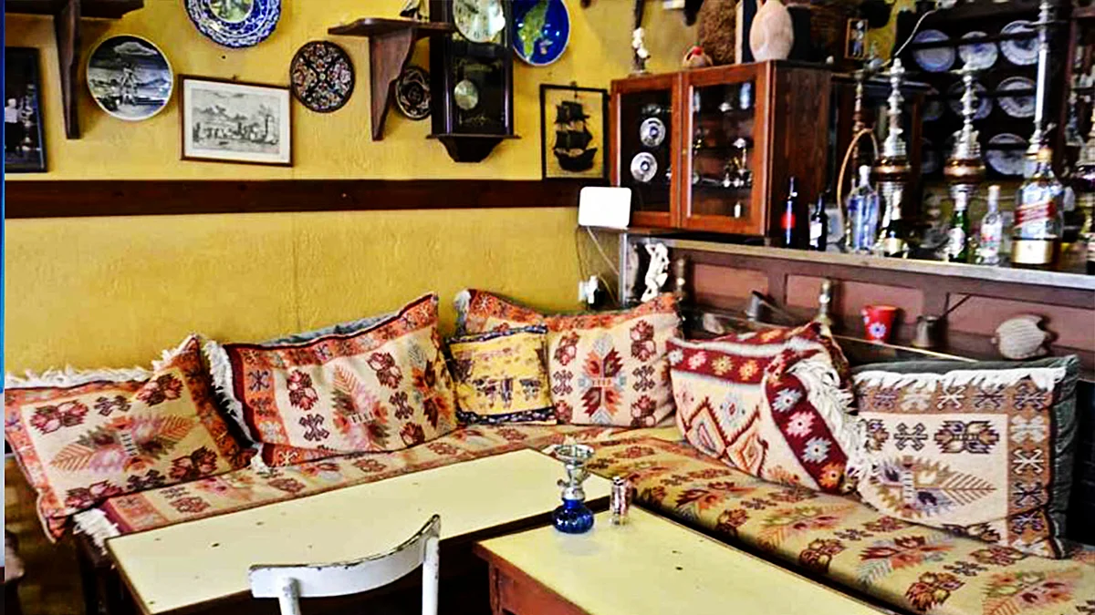 Podany jest dokładny opis typowej tureckiej kawiarni. Charakterystycznym elementem ich wystroju są wydzielone małe pomieszczenia, wyłożone dywanami lub słomianymi matami. W każdym z nich znajduje się tzw. Mongol (gliniane naczynie) „wyłożony gorącym popiołem z węgli drzewianych, o którego goście założonemi nogami usiędą, tytuniu palą i kawę piją czasem”.