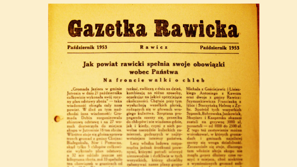 Artykuł zaczyna się wręcz entuzjastycznie: „Gromada Jeziora w gminie Jutrosin w dniu 21 października całkowicie wykonała swój roczny plan dostawy zboża”. Potem wspomina się o gromadzie Dubin, skąd na 27 wozach do punktu skupu w Jutrosinie dostarczono 18 ton zboża.