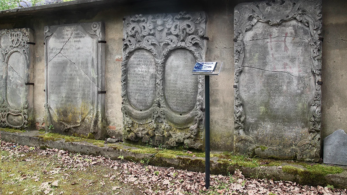 W mur cmentarza wmurowano 12 barokowych płyt nagrobnych z XVIII wieku. Są wykute w kamieniu, mają bogate zdobienia, rzeźbione ramy i niemieckie napisy. Są to przede wszystkim inicjały, symbole, sceny alegoryczne oraz najczęściej roślinna ornamentyka. Najstarsza płyta pochodzi z 1705 roku.