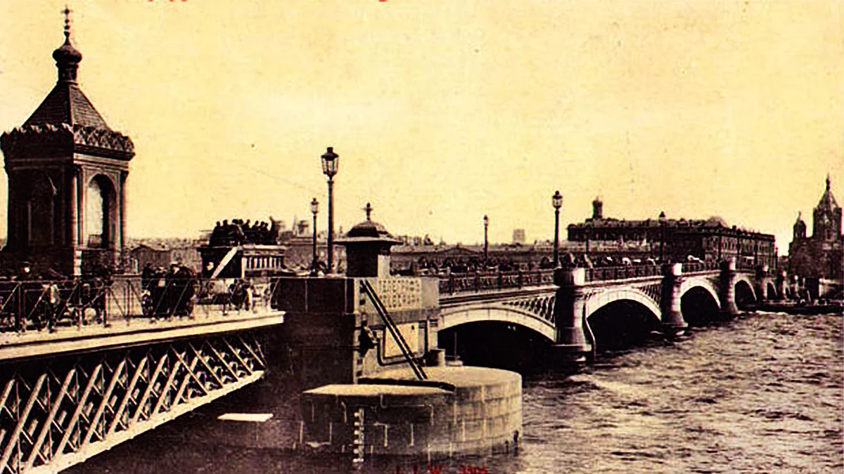 Autorowi chodzi oczywiście o Most Błagowieszczenskij (dawniej Nikołajewskij i lejtnanta Szmidta). Był pierwszą stałą przeprawą na Newie, łączącą centralną część miasta z Wyspą Wasilewską. W jego budowę zaangażowanych było ponad 1,5 tys. ludzi. Oddano go do użytkowania 12 listopada 1850 r. W chwili otwarcia był najdłuższym mostem na świecie, pierwszym, w którym zastosowano nowatorskie konstrukcje kratownicowe.