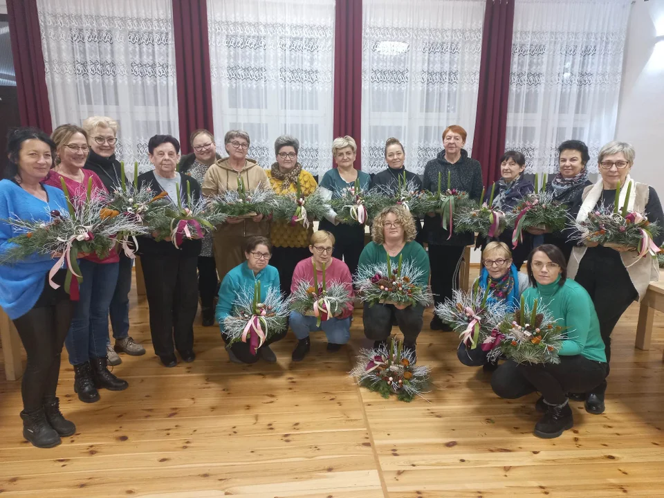 Osiemnaście pań, głównie z KGW z Pomocna, podczas przedświątecznych warsztatów stworzyło stroiki, które przyozdobią stoły na zbliżające się święta. Praca odbywała się pod czujnym okiem Wiesławy Kapały.