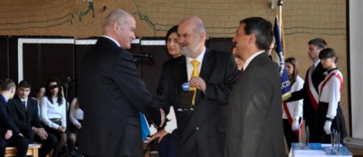 Dyrektor Krzysztof Jarosz i wicedyrektor Krzysztof Kazuń wręczyli przedstawicielom firm okolicznościowe statuetki i certyfikaty „Przyjaciela Szkoły”.