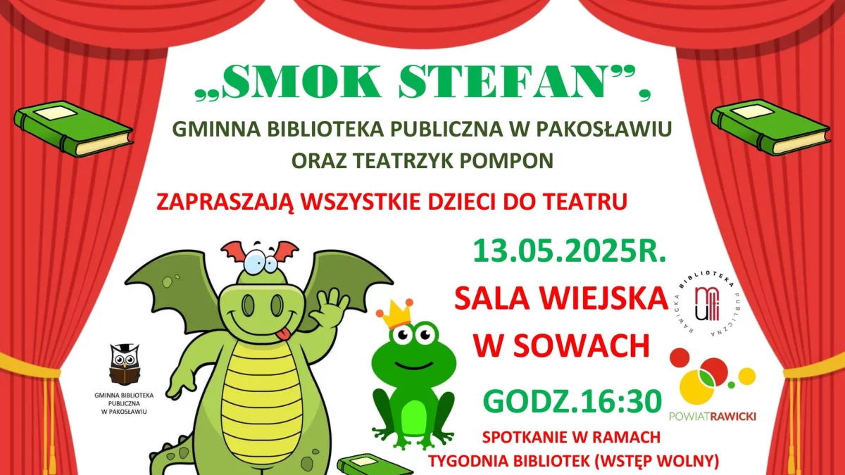 - Wraz z Teatrzykiem Pompon obiecujemy Wam niezapomniane chwile! Kim jest Smok Stefan? Czy lubi czytać książki? Przekonajcie się o tym sami! Liczymy na Waszą obecność. Smok Stefan będzie zadowolony, jeśli będzie mógł Was zobaczyć - zachęca Agnieszka Jeziorska, bibliotekarka z Pakosławia.