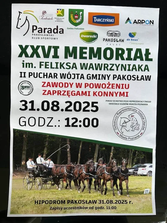 Godz. 12.00 - Zawody w Powożeniu Zaprzęgami Konnymi, XXVI Memoriał im. Feliksa Wawrzyniaka, II Puchar Wójta Gminy Pakosław, hipodrom w Pakosławiu