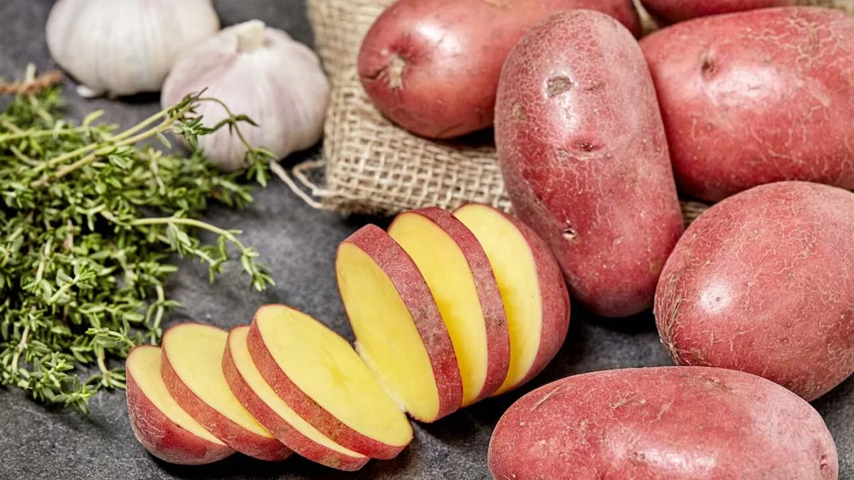 *Barwa skórki jest stałą cechą genetyczną. Większość odmian ziemniaków w polskim rejestrze ma żółtą barwę łupiny. Czerwoną skórką charakteryzuje się wiele odmian, najpopularniejsze są: Bellarosa, Cecile, Oberon, Rosalind, Red Sonia, czy Roko, a różową Irga. Po obróbce termicznej ich miąższ jest słodki i kremowy - w większości raczej kleisty niż sypki.