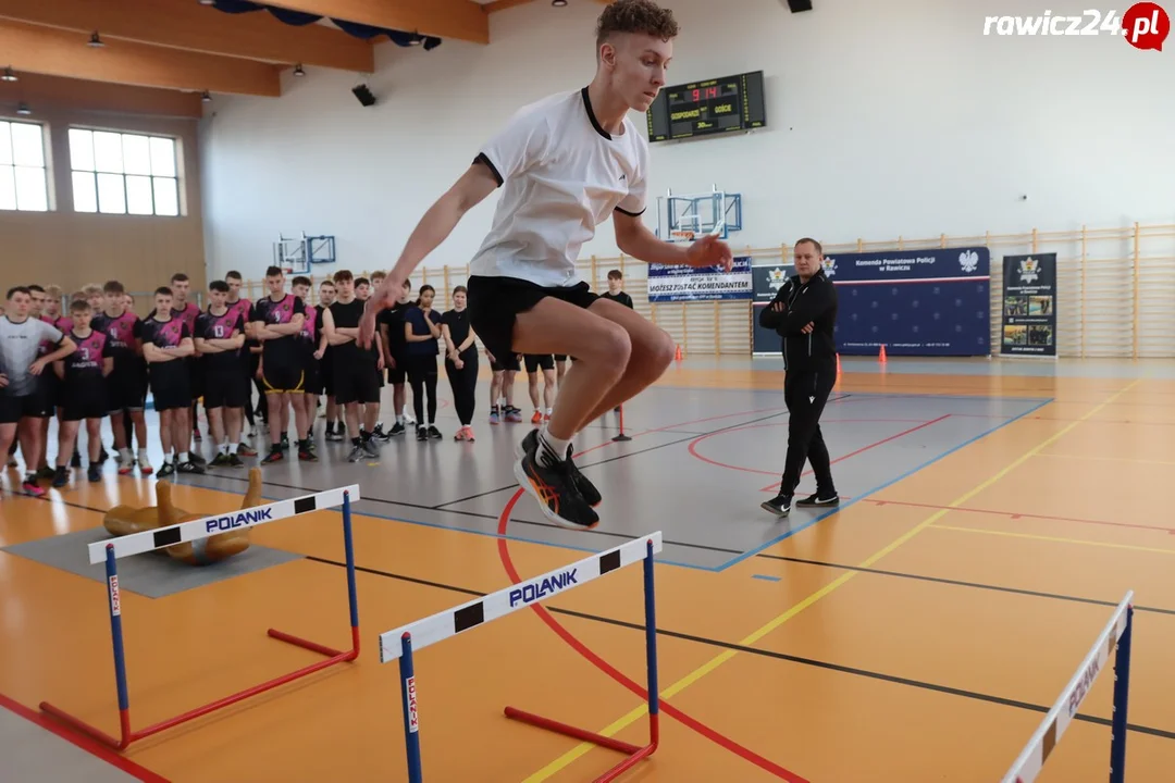 Konkurs składał się z dwóch części: sprawnościowej, w której uczestnicy mieli do pokonania tor z ośmioma przeszkodami, m.in. bieg z 28-kilogramowym manekinem, skoki przez płotki czy rzuty oburącz piłką lekarską oraz teoretycznej, gdzie trzeba było popisać się wiedzą na temat policji. Nad prawidłowym przebiegiem części praktycznej nadzór sprawowali sędziowie: podkom. Tomasz Woliński z komendy wojewódzkiej i Arnold Ratajski - dyrektor I LO w Rawiczu.