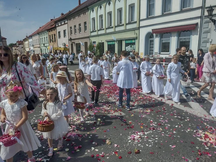 Dziewczynki sypały kwiatki, a dzieci komunijne niosły białe kwiatki przed monstrancją. Pomocą służyli strażacy z OSP Bojanowo, którzy nieśli baldachim i asystowali księdzu.