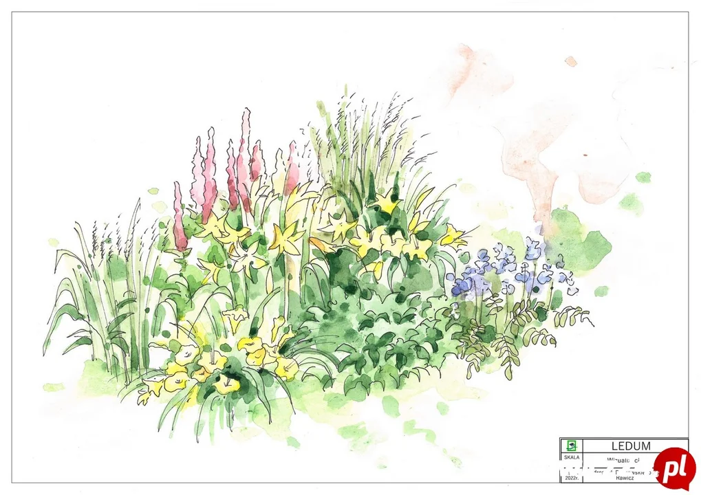 Dla Rawicza projektanci zaproponowali lekko naturalistyczną, średniowysoką rabatę, kwitnącą głównie latem, nawiązującą w kompozycji do trapezowego kształtu terenów zieleni przy szkole.