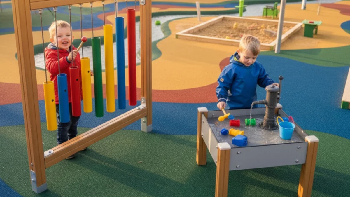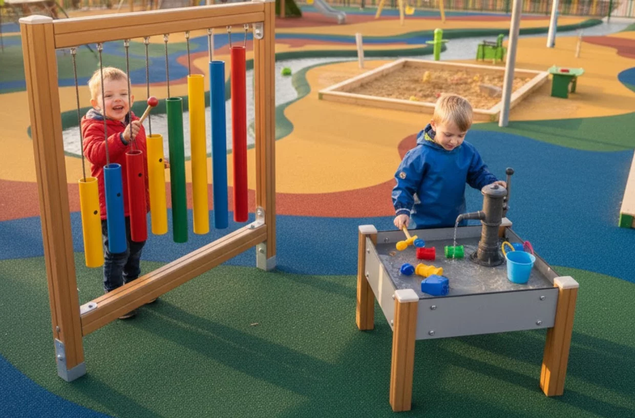 - Strefa zabaw wodą i piaskiem – przestrzeń sensoryczna, która pobudza kreatywność i pozwala na bezpieczne eksperymentowanie z naturalnymi elementami.