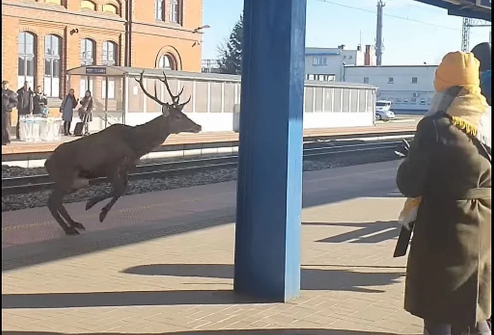 Spokojne słoneczne marcowe popołudnie na dworcu PKP w Jarocinie. Ludzie czekają na przyjazd pociągu. Sporo pasażerów stoi na peronach. Nagle, od strony dworca nadbiegają jelenie...