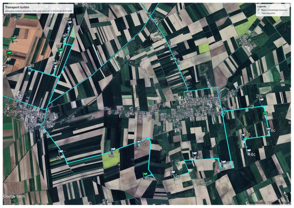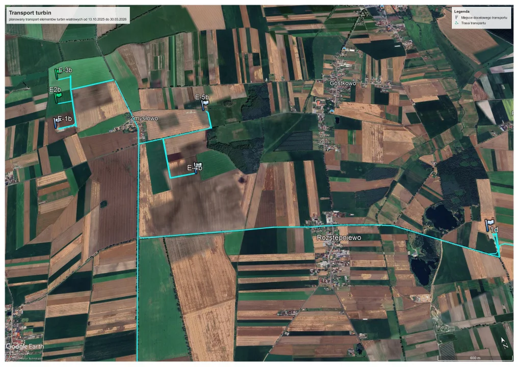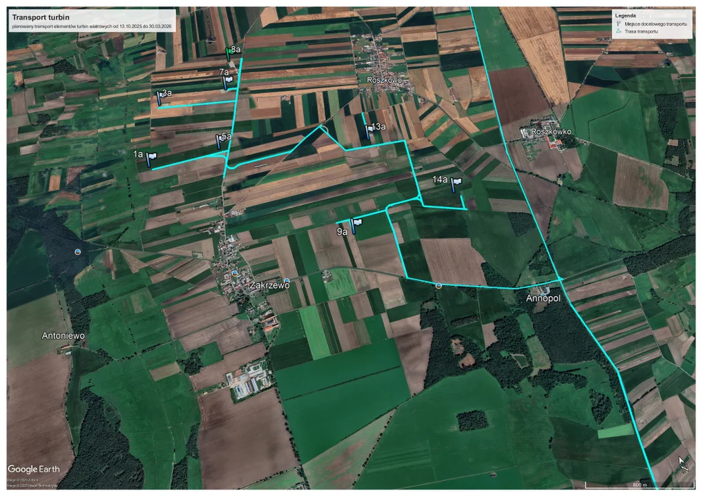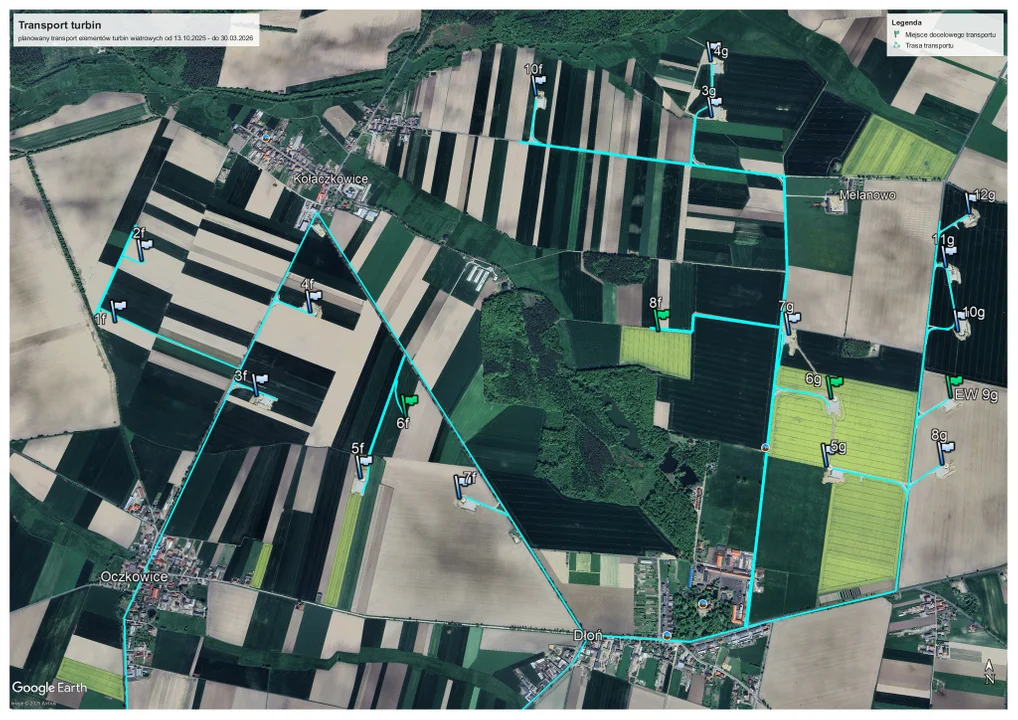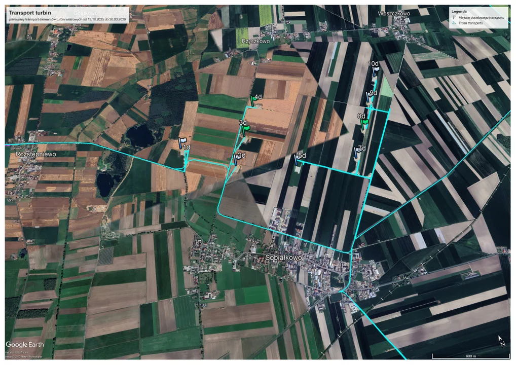 Już wiadomo, że pierwsze transporty turbin wiatrowych odbędą się w nocy z 12 na 13 października, ale ogólnie dowozy części potrwają od 13 października 2025 r. do 30 marca 2026 r.