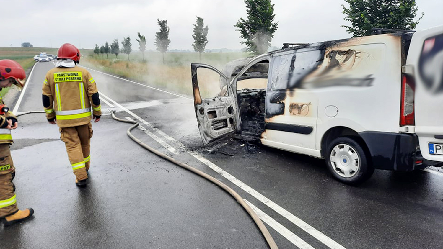 Dyżurny Komendy Państwowej Straży Pożarnej w Rawiczu otrzymał zgłoszenie o pożarze auta. Fiat scudo stał na drodze pomiędzy Gołaszynem, a Zaborowicami w okolicy skrzyżowania Bojanowo-Trzebosz-Zaborowice.