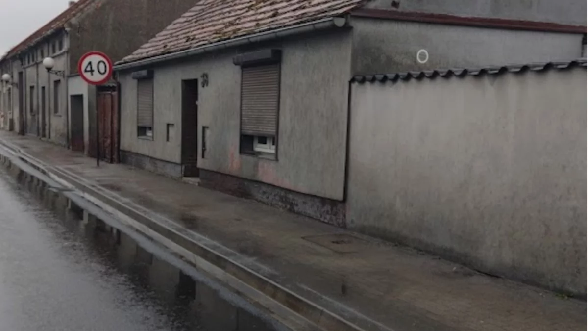 - Brak ochrony: Zabudowania znajdują się bezpośrednio przy chodnikach, bez żadnych pasów ochronnych, co naraża elewacje na ciągłe zalewanie wodą i błotem.