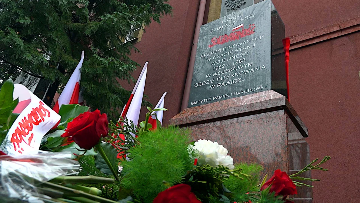Po poświęceniu obelisku przez księdza kanonika Wojciecha Prostaka, odsłonięto tablicę, na której widnieje inskrypcja: "Pamięci działaczy NSZZ Solidarność represjonowanych w czasie stanu wojennego 1982 - 1983 w wojskowym obozie internowania w Rawiczu. Instytut Pamięci Narodowej."