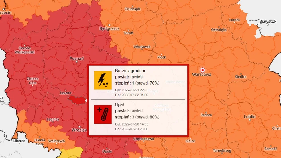Jak czytamy w komunikacie IMGW-PIB w powiecie rawickim, a także znacznej części Wielkopolski, Dolnego Śląska i woj. lubuskiego prognozowane są burze, którym miejscami będą towarzyszyć silne opady deszczu do 20 mm oraz porywy wiatru do 80 km/h. Miejscami może się pojawić także grad. Synoptycy szacują na 70% prawdopodobieństwo wystąpienia groźnych zjawisk pogodowych.