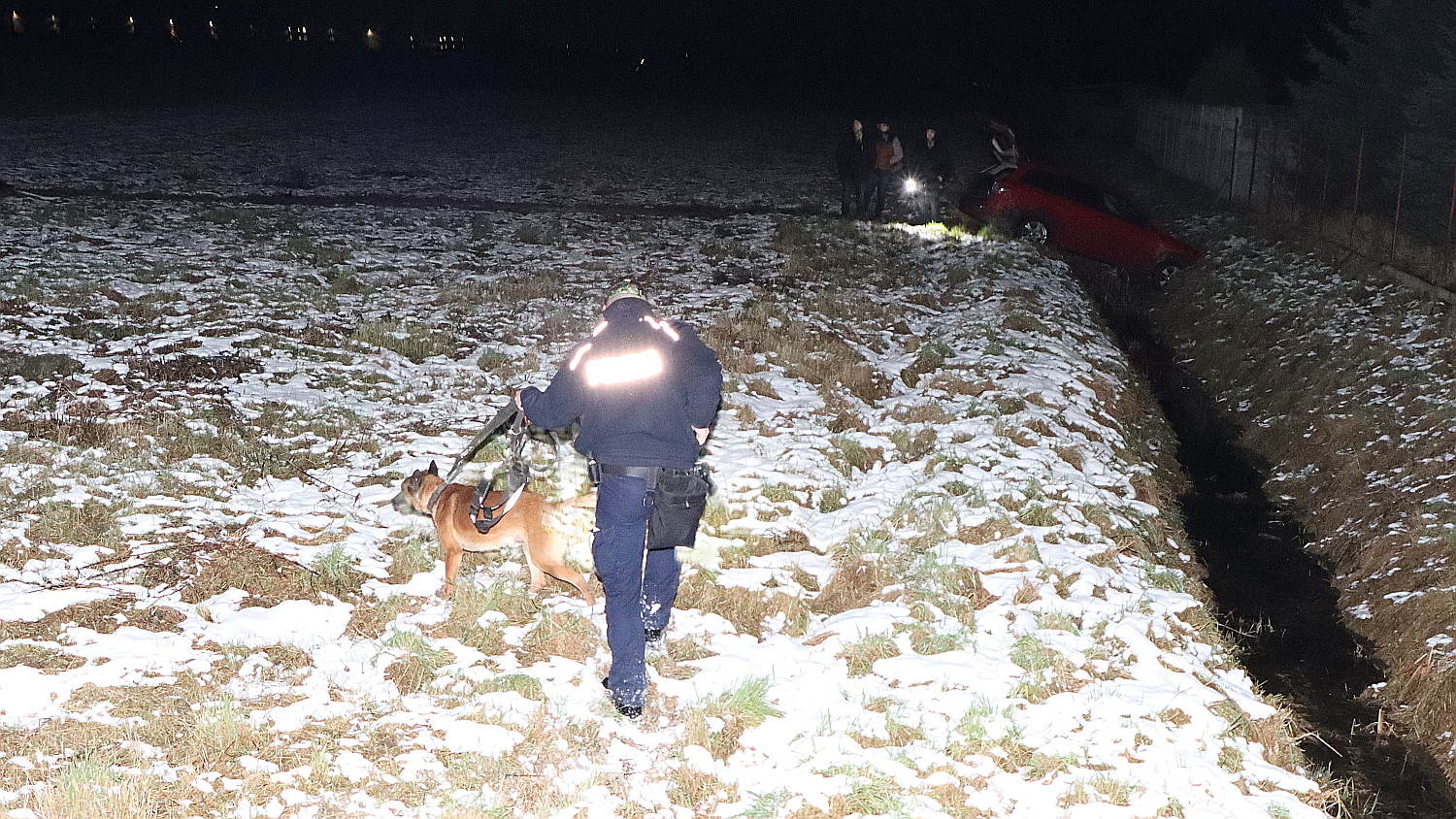 Policjanci ruszyli w pościg za sprawcami. Para, która uciekała samochodem, dotarła do zakrętu pod Łaszczynem. Tam kierowca nie zapanował nad pojazdem i wypadł z drogi, a po przejechaniu chodnika, "wylądował" na polu. Ostatecznie, mazda zatrzymała się w rowie. Para wyskoczyła z samochodu i uciekała pieszo, a za nimi ruszyli policjanci.