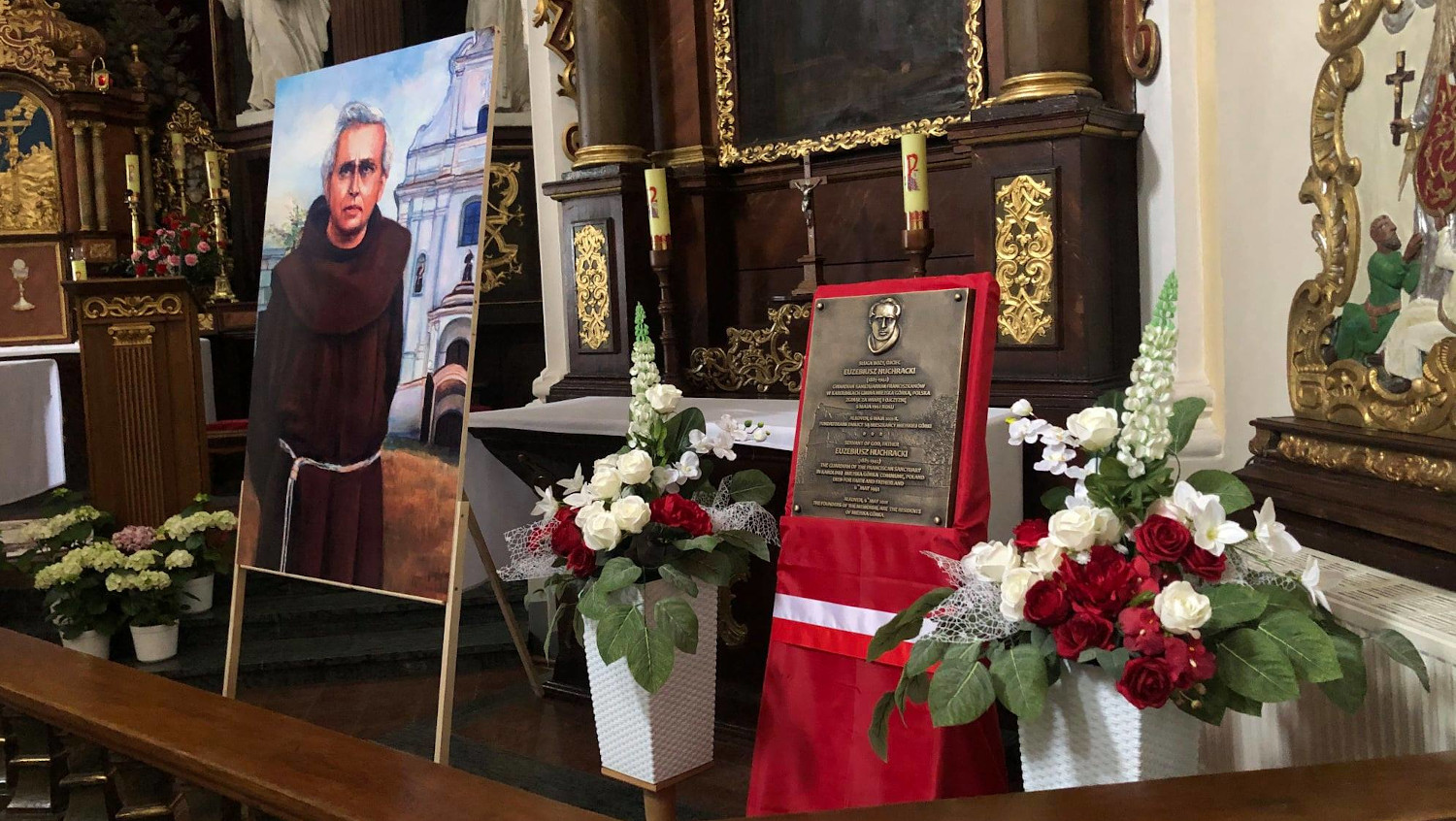 „Sługa Boży Ojciec Euzebiusz Huchracki (1885-1942). Gwardian Sanktuarium Franciszkanów w Karolinkach, gmina Miejska Górka, Polska. Zginął za wiarę i Ojczyznę 6 maja 1942 roku. Alkoven, 6 maja 2021r. Fundatorem tablicy są mieszkańcy Miejskiej Górki.”