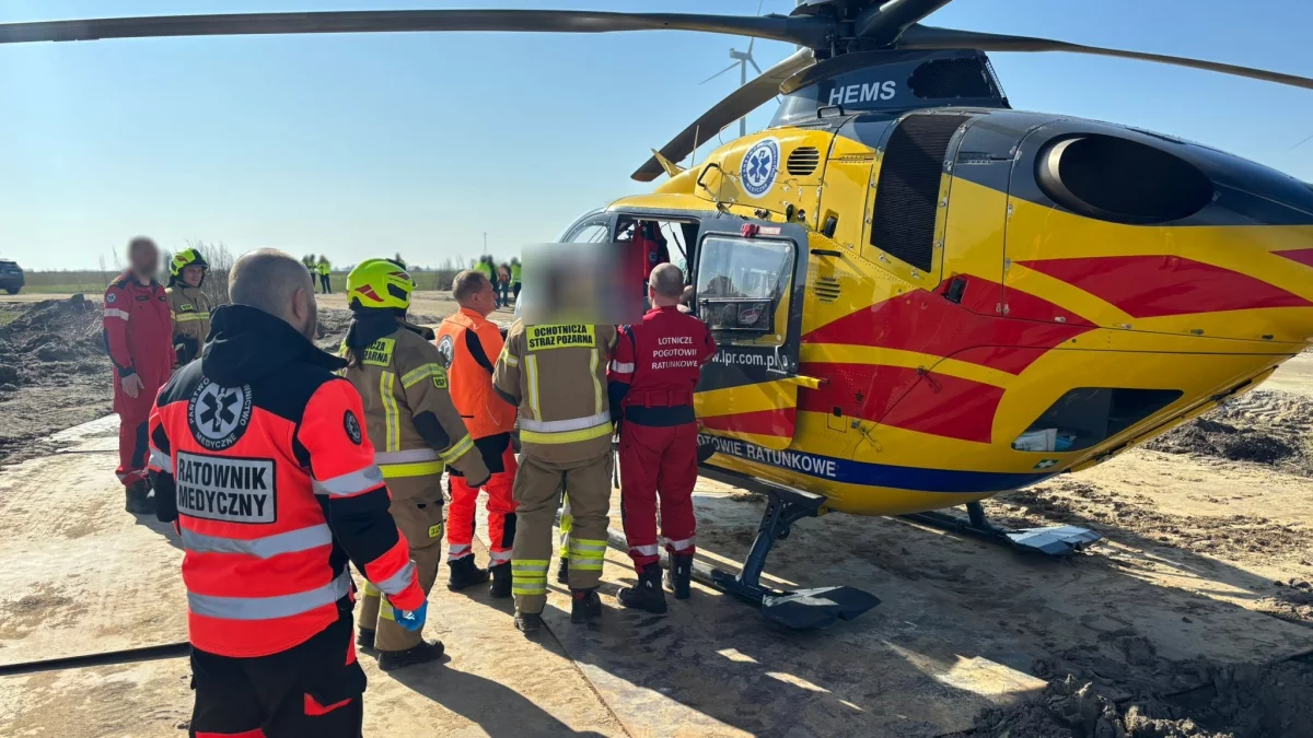 Zgłoszenie wpłynęło do służb w sobotę (7 marca 2026 r.) kilkanaście minut przed godz. 11.00. Do wypadku doszło na terenie budowanej farmy wiatrowej pomiędzy Sobiałkowem a Woszczkowem. Ucierpiał 50-latek. Przebywał na wysokości - wewnątrz budowanego wiatraka. W trakcie prowadzonych prac spadł pręt. Doszło do wypadku. Mężczyzna miał założony kask, ale i tak pręt wbił się w głowę 50-latka.