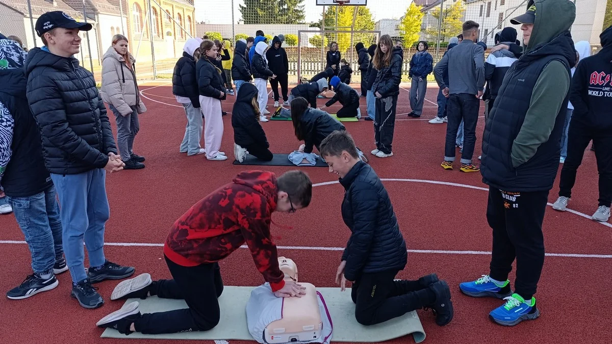 Punktualnie w południe uczniowie klas szóstych, siódmych i ósmych przystąpili do prowadzeniu resuscytacji krążeniowo-oddechowej na fantomach, którą prowadzono przez przez 30 minut. Wydarzenie odbyło się na boisku szkolnym.