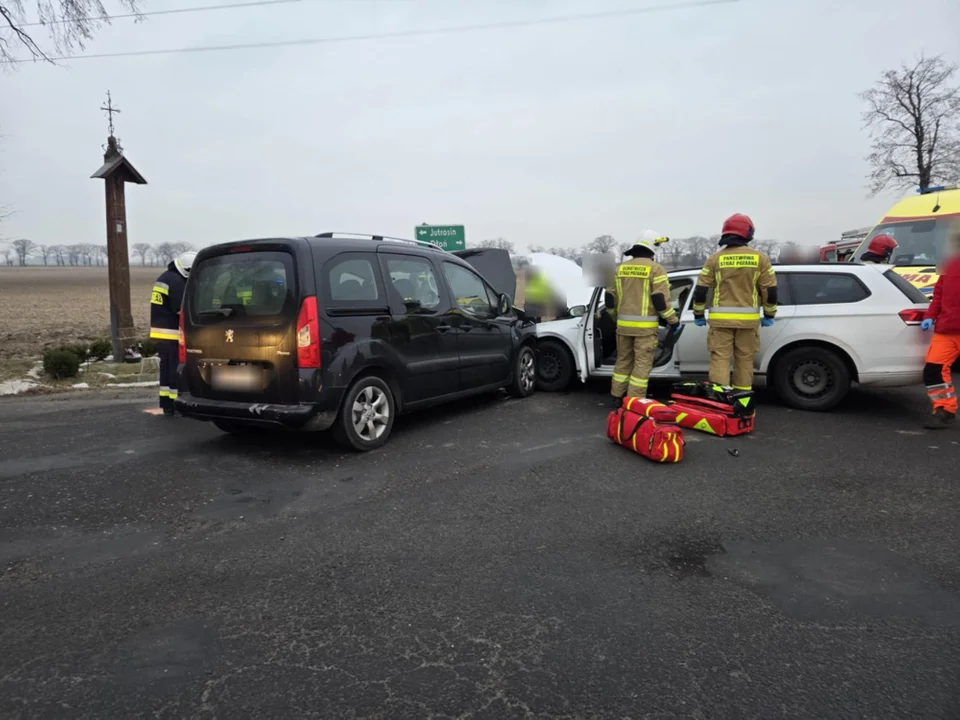 Do kraksy doszło w piątek (30 stycznia 2026 r.) około godz. 15.30. Z ustaleń służb wynika, że kierująca Volkswagenem nie ustąpiła pierwszeństwa przejazdu i doprowadziła do zdarzenia z prawidłowo jadącym Peugeotem. O kraksie z udziałem mieszkańców powiatu rawickiego poinformowano służby. Na miejscu interweniowali policjanci, dwa zespoły ratownictwa medycznego, a także strażacy zawodowi z Rawicza i ochotnicy z Jutrosina, Szkaradowa i Rogożewa.Po zabezpieczeniu terenu akcji i odłączeniu akumulatorów strażacy udzielili kierowcom pierwszej pomocy, po czym przekazali pod opiekę przybyłym zespołom ratownictwa medycznego. Oboje trafili do szpitala. Na czas działań wprowadzono ruch wahadłowy, a po zapadnięciu zmroku strażacy oświetlili teren za pomocą najaśnic.