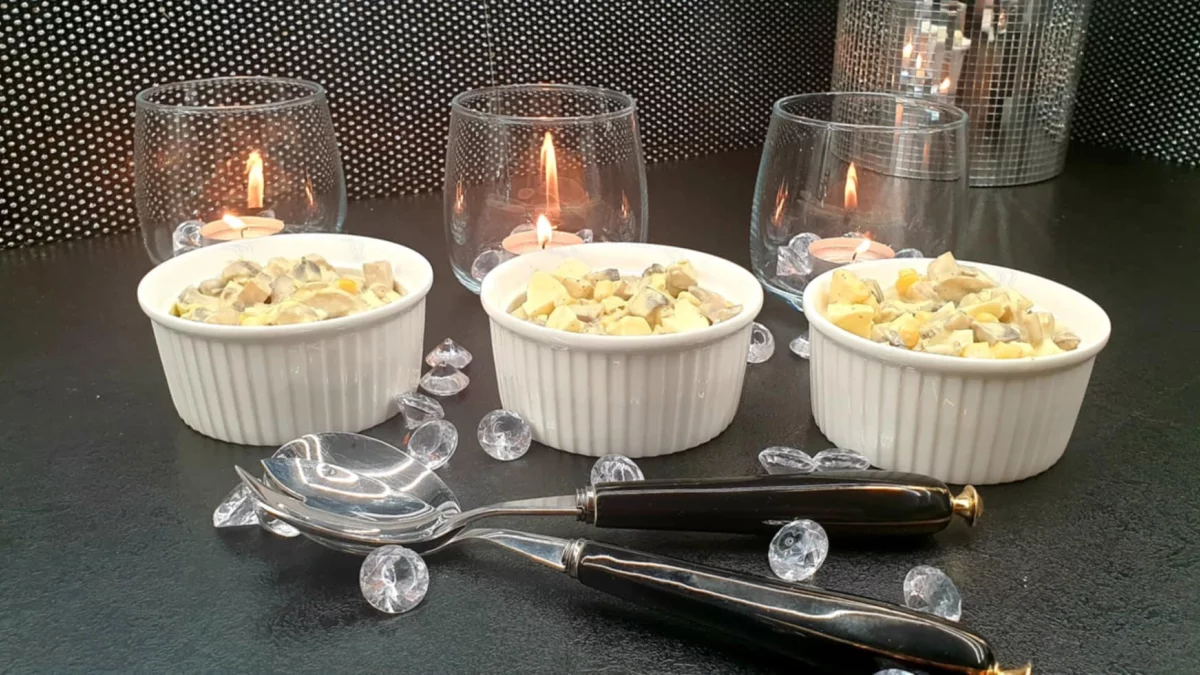 - Składniki: 650 g pieczarek, 1 cebula, 4 ogórki konserwowe, kukurydza konserwowa, 5 jajek, ok. 3 czubate łyżki majonezu, sól, pieprz,1 por.