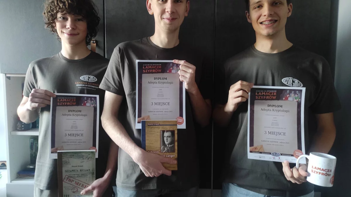 Za swój wybitny wynik Marcin, Karol i Adrian zostali uhonorowani nie tylko prestiżowym tytułem laureatów trzeciego miejsca w Polsce, ale także zestawami nagród. Do rąk młodych kryptologów trafiły koszulki, kubki oraz literatura tematyczna, która pozwoli im jeszcze głębiej wejść w świat tajemnic państwowych i matematycznych zagadek.