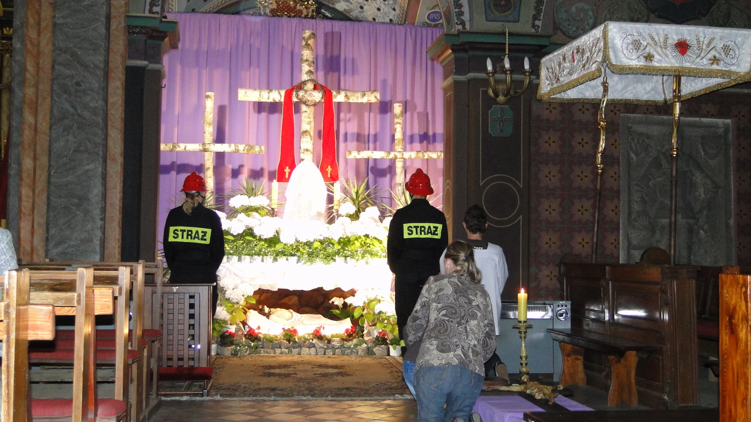 W Wielki Piątek w kościołach po nabożeństwie odsłaniane są groby Chrystusa. Wierni przychodzą na adorację, która trwa aż do rezurekcji. Groby są starannie przygotowane i ustrojone kwiatami. W wielu kościołach czuwa przy nich straż - symbolicznie nawiązująca do warty żołnierzy rzymskich pilnujących grobu Chrystusa. Składa ona się z mężczyzn i chłopców noszących mundury.