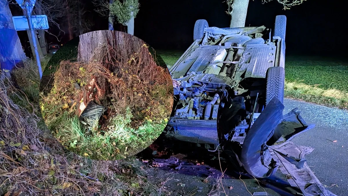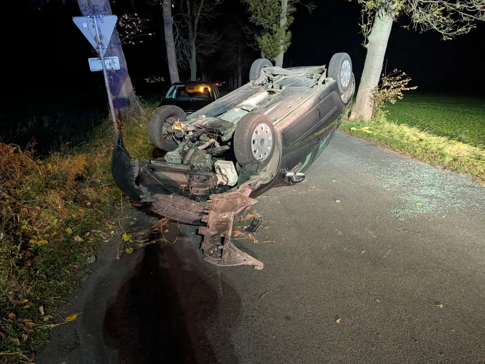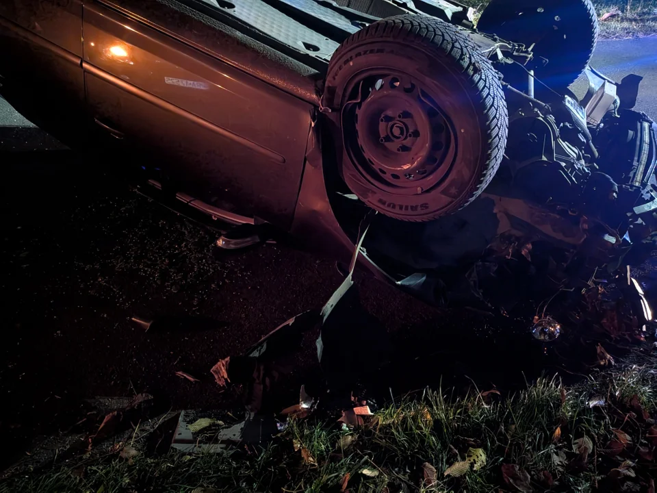 Mężczyzna gwałtownie skręcił, w wyniku czego wpadł w poślizg, uderzył w drzewo i dachował. Auto zatrzymało się na jezdni.