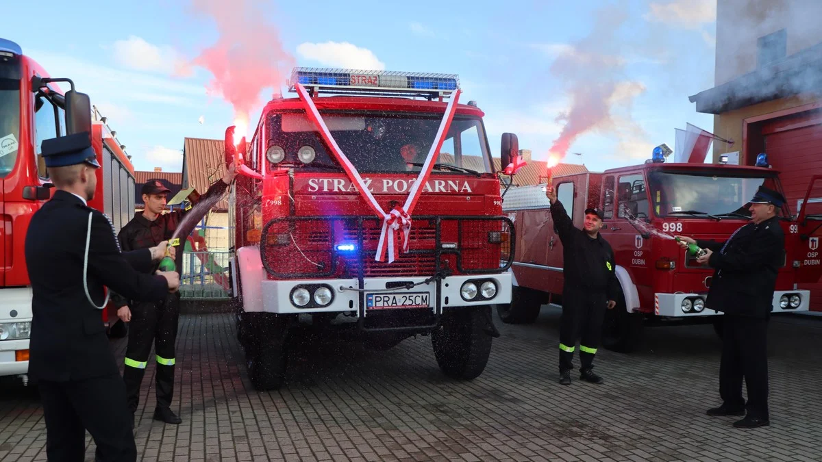 Modlitwę odmówił i wóz strażacki poświęcił ks. proboszcz Mirosław Wawrzyniak. Później auto zostało polane szampanem przez prezesa jednostki w Dubinie - Michała Bielerzewskiego i naczelnika - Bartosza Alcera, a strażacy odpalili race. Nie zabrakło pamiątkowych zdjęć przy aucie.