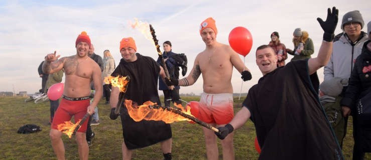 Kilkanaście minut w lodowatej wodzie jutrosińskiego zalewu spędziło ponad 100 morsów, którzy utworzyli w niej „Gorące serce”.