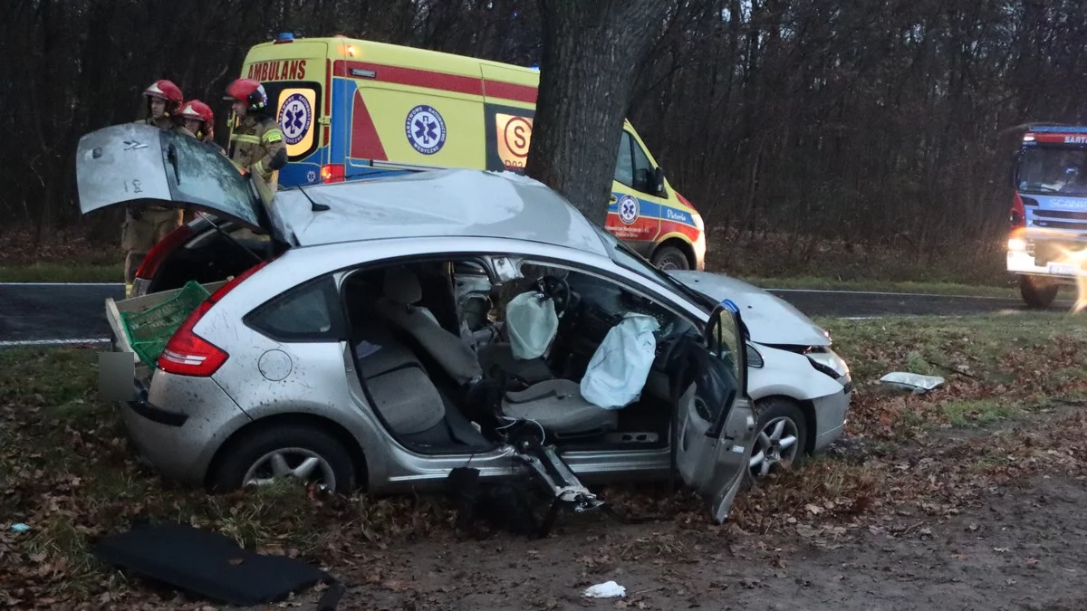 Citroenem C4 podróżował wyłącznie kierowca. Już na terenie powiatu rawickiego zjechał na pobocze i uderzył w przydrożne drzewo. Młody mężczyzna nie mógł opuścić pojazdu. Samochód był roztrzaskany.