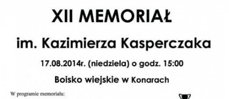XII edycja Memoriału im. Kazimierza Kasperczaka odbędzie się w niedzielę ( 17 sierpnia) o godzinie 15.00 na boisku wiejskim w Konarach.