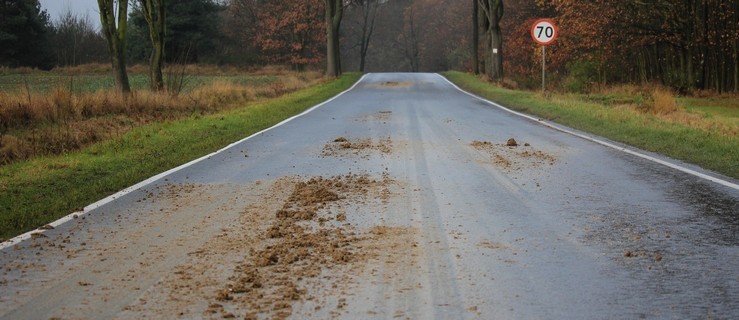 Przypomina, że zabrudzenie drogi jest wykroczeniem z art. 91 KW, za które grozi kara grzywny w wysokości nawet do 1.500 złotych. Ponadto sprawca musi usunąć całe zabrudzenie.