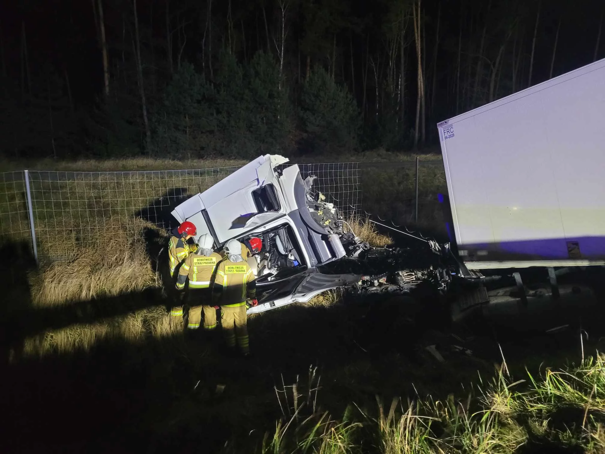 Działania na miejscu zakończyli już strażacy i załoga karetki. Dotarł natomiast ciężki sprzęt, który będzie wyciągał ciągnik siodłowy z rowu, a także naczepę.